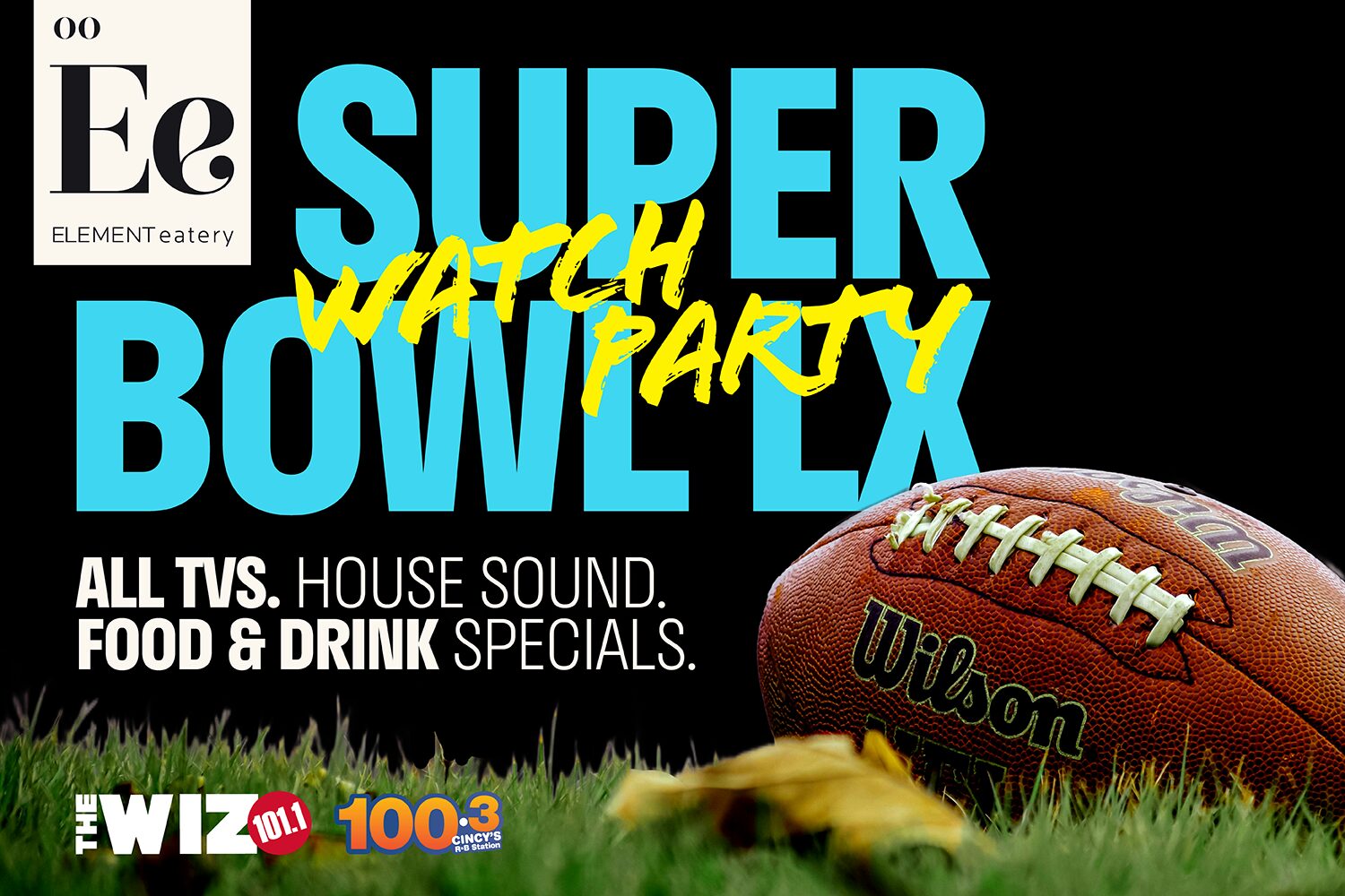 FeaturedElement Eatery 5350 Medpace Way, Cincinnati, OH, United StatesJoin us—and our friends from The WIZ 101.1 and 100.3 Cincy's R+B Station—for a Super Bowl Watch Party at Element Eatery and enjoy the big game with food and drink…